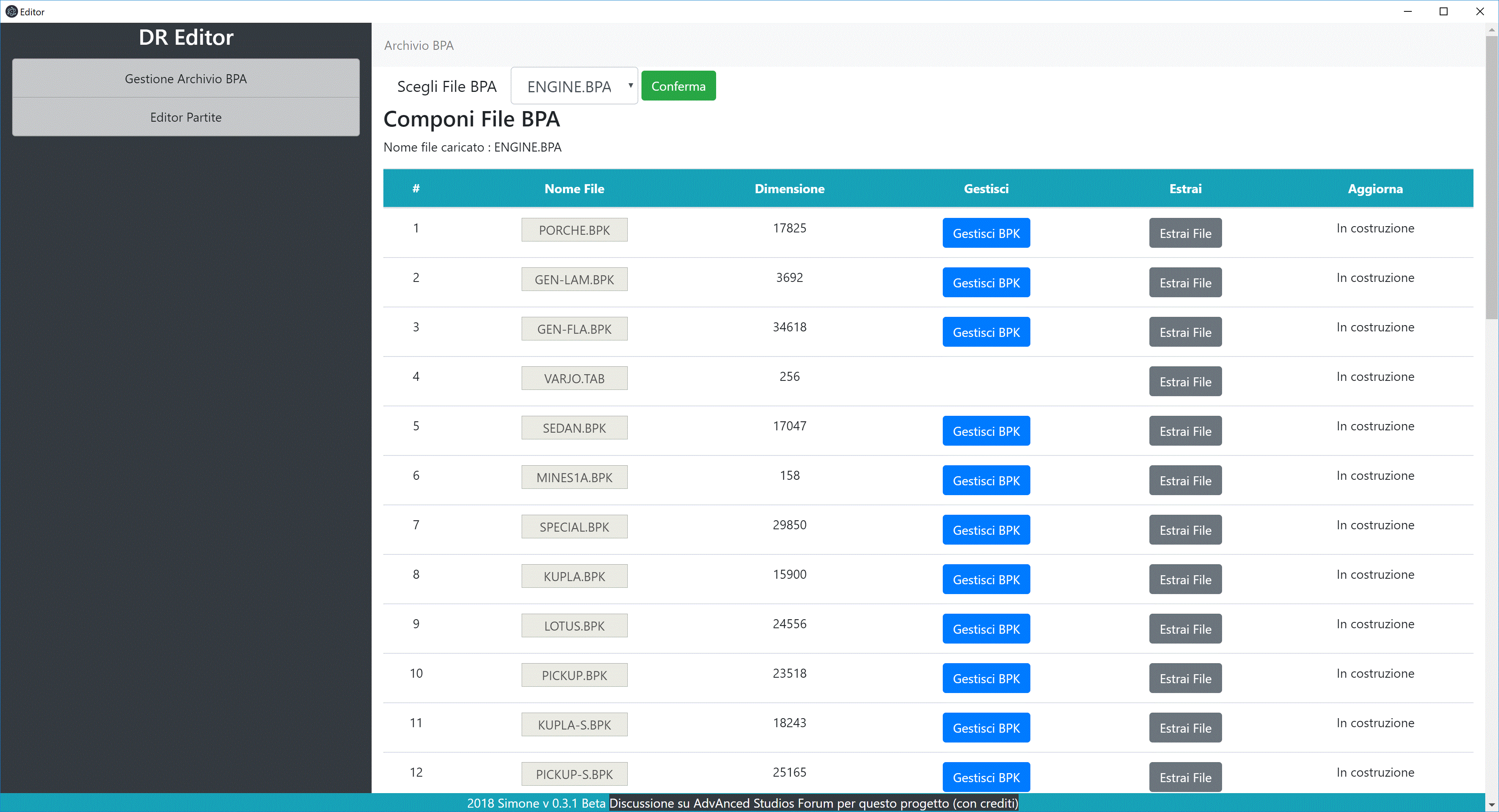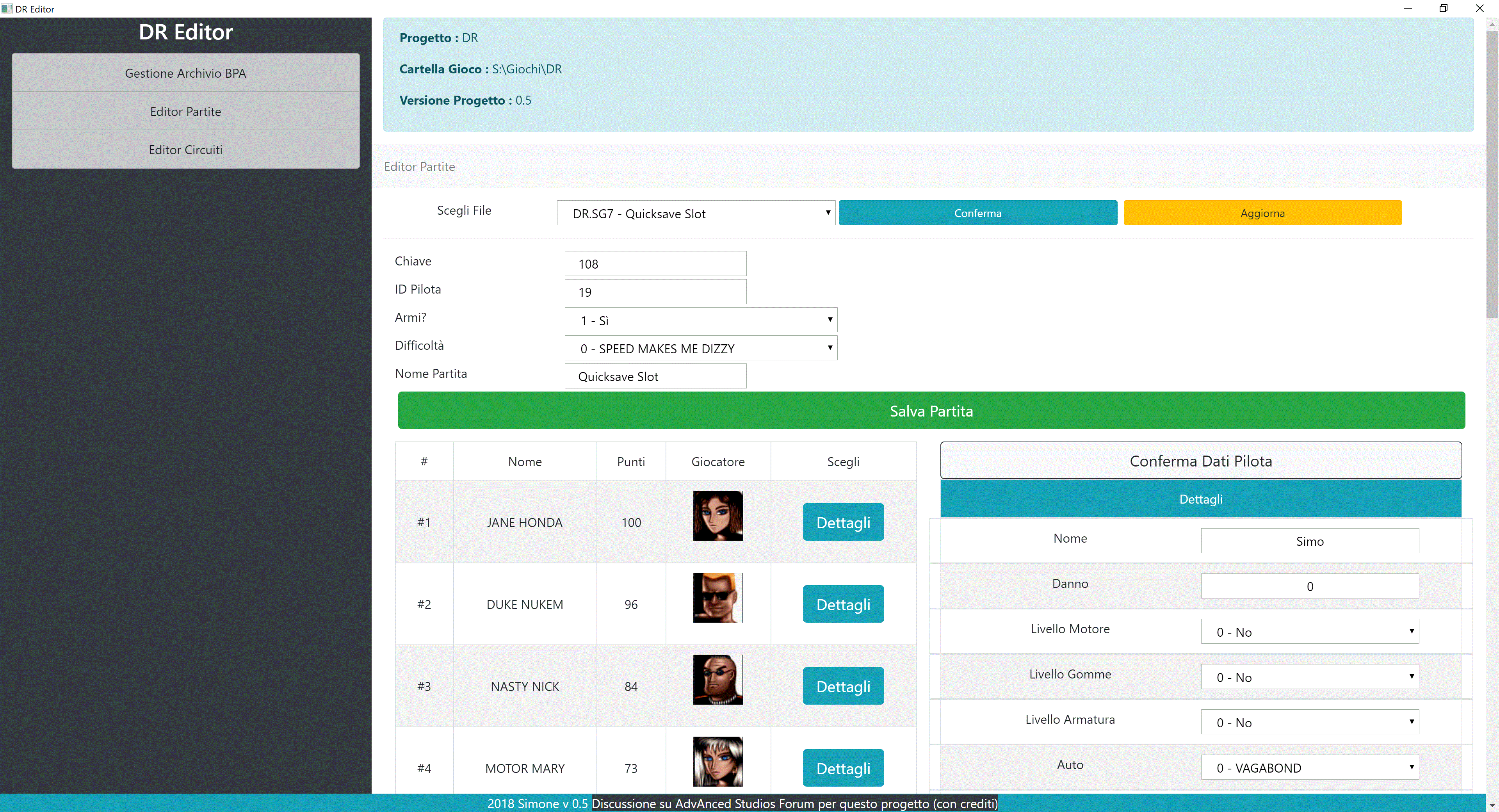 Ciao a tutti Da questo messaggio e dai successivi, dopo l'editor dei salvataggi sto guardando altri aspetti del gioco per avere un editor completo per mod del gioco ... ... ed eccomi ad una versione beta! (Data 22/11/2018) Download DR Editor Beta (v. 0.5) Per usare l'interfaccia in italiano, modifica il file config.txt della cartella src, scrivendo "it" (invece di "en" o altro) Se hai già scaricato versioni precedenti alla 0.5, occorre scaricare nuovamente l'intero file qui sopra. La versione 0.5 ha un sistema di aggiornamento automatico! Quindi scaricando questa versione non occorre più scaricare nuovamente il file! (alcune parti non sono ancora funzionanti) (open source, sorgenti principalmente nella cartella src) Novità versione 0.5 : Aggiunti database e progetto Editor Partite Estrazione immagini di gioco Crediti e risorse utili : Ringrazio per l'ispirazione e le idee Enrique Somolinos ( http://www.dreerally.com/ e relativo progetto https://github.com/enriquesomolinos/DreeRally) (Thank you very much again, @somo) thandor.net per l'articolo : http://thandor.net/article/8 Ringrazio Ceidwad per queste informazioni (http://www.shikadi.net/moddingwiki/Death_Rally e http://www.shikadi.net/moddingwiki/Death_Rally_BPA_Format) Inoltre, per proseguire nello sviluppo di questo editor, altre risorse utili Serie di articoli sul formato GIF (GifLib) : http://giflib.sourceforge.net/whatsinagif/index.html Grafx2 per aprire file .rix Screenshot versione 0.5 : Hi! Here is the new version 0.5! How to use : Extract the contents of the zip file to install the editor. When the editor is first started, the folder where the game is located is requested. Savegame editor: Choose File / Confirm: load the chosen savegame Update: Read the file from the game and update the editor database To change the savegame, choose the driver whose details you want to edit (press details button) and then Confirm Driver Data (white button). To save the game (overwrites the file in the game!) Modify (if needed) the general data of the savegame and press Save Game. Manage BPA Archive : there are updates in this version Confirm to select the BPA file Extract ALL game images! (yellow button): it is self-explanatory Extract File to extract the file from the archive as it is. For BPK files, extract BPK to decrypt the BPK, extract image decrypts the bpk, and then writes bmp and rix images.